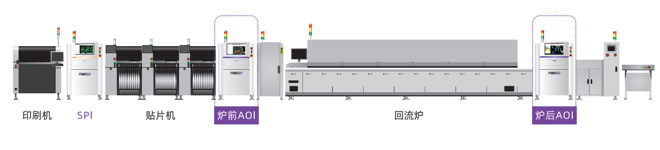 ■ 三點(diǎn)照合 SPI、爐前AOI、爐后AOI三個(gè)設(shè)備的連線處理,快速定位 缺陷的根本原因。 | ■ 掃碼自動(dòng)換線 通過識(shí)別PCB 條碼自動(dòng)調(diào)寬并調(diào)用程序,無需人工參與, 同時(shí)支持MES指令實(shí)現(xiàn)。 | |